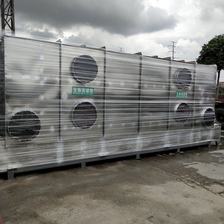 生物滴濾塔主體為填充塔,內有一層或多層填料,填料表面是由微生物區系形成的幾毫米厚的生物膜。含可溶性無機營養液的液體從塔上方均勻地噴灑在填料上,液體自上向下流動,然后由塔底排出并循環利用。有機廢氣由塔底進入生物滴濾塔,在上升的過程中與潤濕的生物膜接觸而被凈化,凈化后的氣體由塔頂排出。在歐美、日本等地,生物滴濾塔工藝被廣泛應用于污水廠臭氣處理工程中。